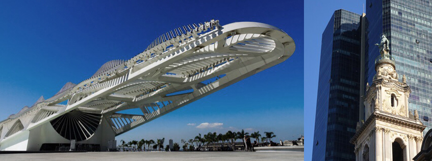 2. Mai 2016: Museu do Amanhã von Calatrava (L). Kirche im Dorf (R).