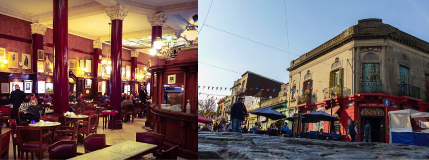 8. Mai 2016: Tortoni, das legendäre Café für Intellektuelle und Schöngeister (L). La Boca, ein Vergnügungsviertel im alten Hafenbezirk (R).