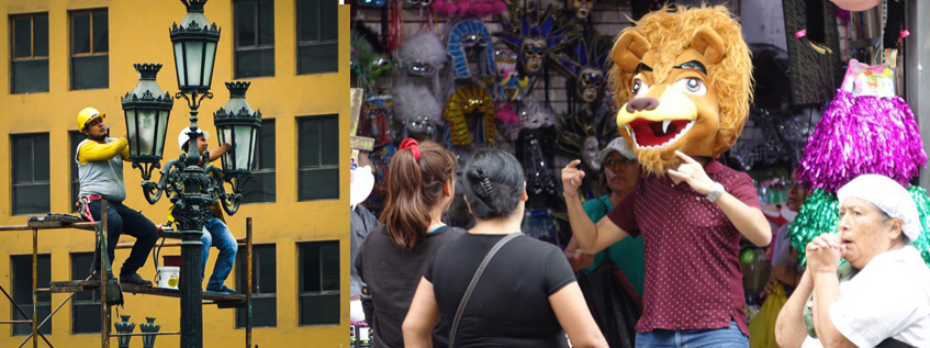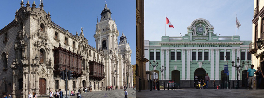 19. Mai 2016: Plaza Mayor in Lima (L). Der Ex-Stadtbahnhof der nun zu Ehren von Mario Vargas Llosa (Literatur-Nobelpreisträger) ein Literatur-Museum ist (R).