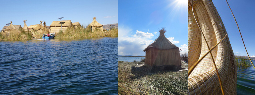 26. Mai 2016: Eine der zahlreichen schwimmenden Inseln der Urus auf dem Titicaca-See. Diese Art Insel hat eine Lebensdauer von ca. 20 Jahren, danach muss eine neue erstellt werden. Typische Totora-Schilf-Wohnhäuser auf der Insel. Allerdings ist die Bleibe bei der Trockenheit sehr feuergefährdet, dafür ist aber genügend Löschwasser vorhanden.