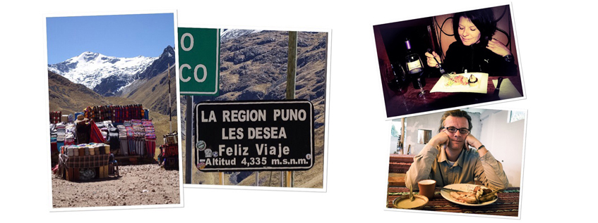28. Mai 2016: Auf der Fahrt von Puno nach Cusco. Seit einigen Tagen bewegen wir uns auf sehr hohem Niveau: 3000 .. 4500 m ü.M. Zum Vergleich: Die Bergseilbahnstation der Klein-Matterhorn befindet sich auf 3800 m ü. M. (L). Comidas (R): Das untere Bild entstand bei einer Degustation von „Pachamanga“, einem traditionell nach peruanischer Art im Lehm-Erdofen zubereitetes Gericht. Eine Tischreservation ist nicht erforderlich. Das obere Bild enstand in der zurzeit angesagtesten Bodega Cicciolina in Cusco, wo Tische mindesten drei Monate im voraus gebucht werden müssen.