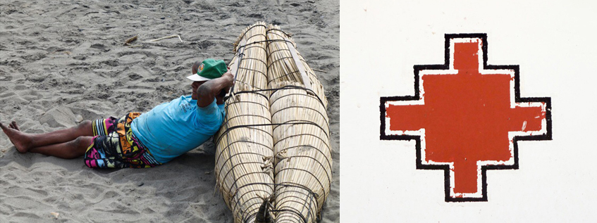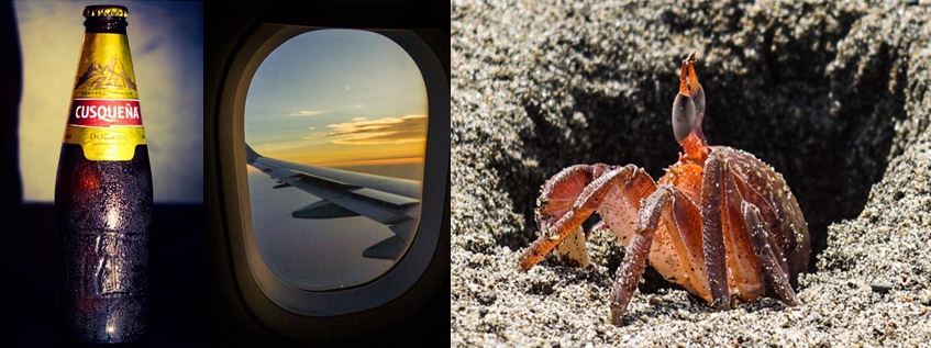 6. Juni 2016: Heute grosses Abstimmungswochenende in Perú und darum totales Alkoholverkaufsverbot: Ley seca! Gilt aber nicht für die Hotelbar (L). Flug nach Huanchaco (M). Gesichtet am Strand von Huanchaco, direkt unterhalb meines Badetuchs (R).