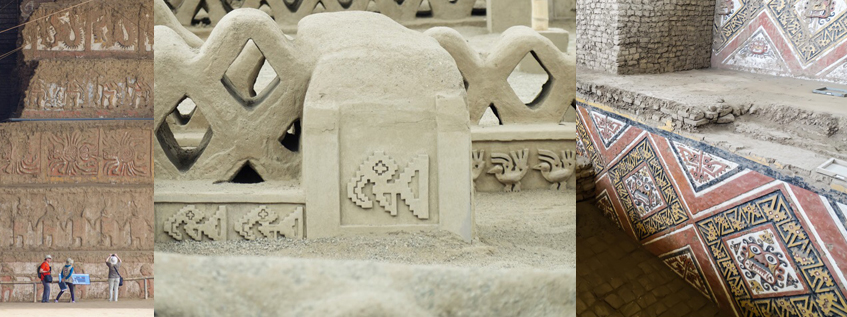 8. Juni 2016: Ein Teil der Mondpyramide in Huaca de la Luna bei Trujillo, erbaut von den Mochica, welche weit vor der Chimú- und Inkaperiode zwischen 200-600 n.Chr. die Gegend bevölkerten. Antike Bitmapgrafik (M).