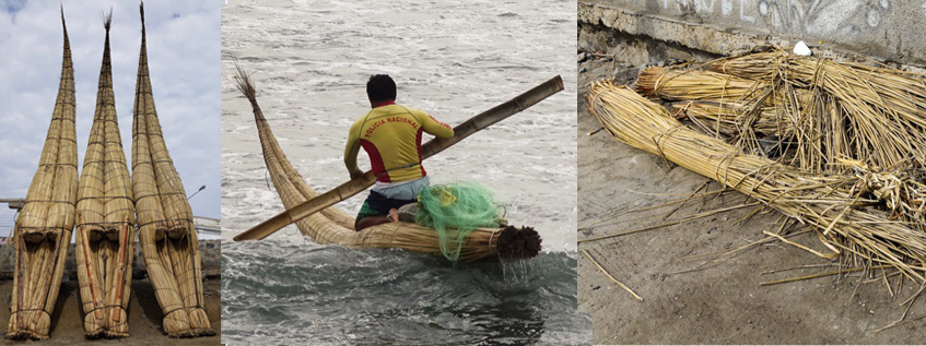 9. Juni 2016: Caballitos de totora (Schilfpferdchen) der lokalen Fischer (L). Schilfpferdchen beim Auslaufen (M). Schilfpferdchen nach Ablauf der Werftgarantie (R).