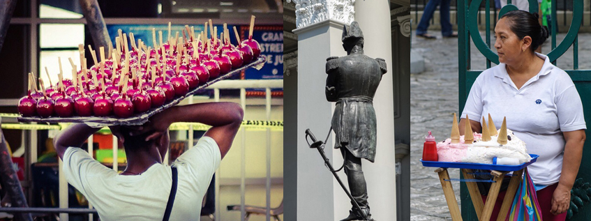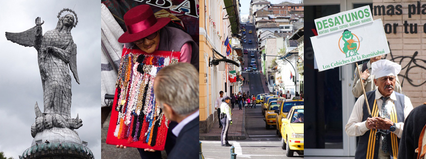 14. Juni 2016: Sind alle 72 Zuckeräpfel verkauft, könnte man das Blech neu bestücken oder beim heutigen Copa América-Fussballmatch Ecuador gegen Haiti mitfiebern (L). Antonio José de Sucre, General unter Simón Bolívar, inspiziert seit 1908 ausschliesslich und bei jeder Witterung die dahinterliegende Hausfassade (M). Das mobile Dessertbuffet (R).