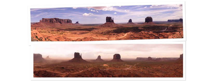 29. Juni 2016: Das Monument Valley in Arizona vor unserem Besuch mit dem «Lightning McQueen» und nach der Rückfahrt mit 70mph über die staubige Piste.