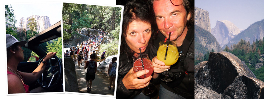 4. Juli 2016: Kolonnenfahren im Tal und Gruppenwanderung am Berg bedeutet US-Nationalfeiertag (L). Fulldome, weil zweimal Halfdome (R).