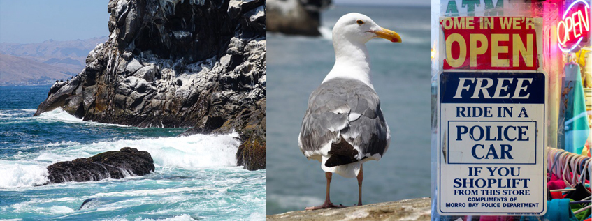 7. Juli 2016: Am Morro Bay an der Westküste: Das Weisse, das an den Felsen klebt ist kein Schnee (L). Dieser sorgt für den üppigen Schneefall am Morro Bay (M). Die Chance für diejenigen, die gerne einmal bevorzugt durch die abendliche Rush-Hour kommen wollen.