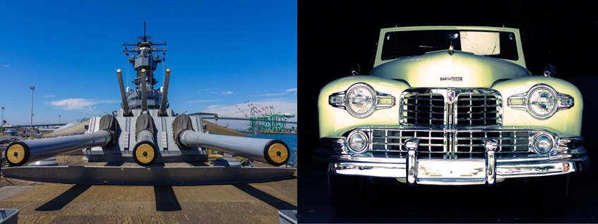 11. Juli 2016: Revolverheld am Pier von Long Beach bei Los Angeles (L). Shop mit US-Cars in San Luis Obispo (R).