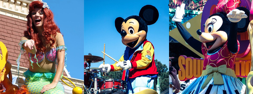 13. Juli 2016: Im Disney-Land in Anaheim bei Los Angeles hält Mermaid Ariel im Fischkostüm Ausschau nach ihrem Prinz Eric (L). Mickey Mouse in trendiger Streetware spielt Drums (M). Minnie ist mit ihren 87 Lebensjahren 27 Jahre älter als der Park, der erst seinen Sechzigsten feiert (R).