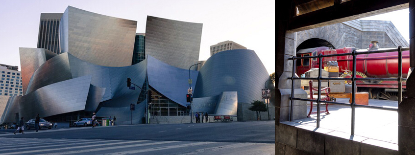 14. Juli 2016: Disney ohne runde, schwarze Ohren und kostenlos anzusehen - von aussen wenigstens. Die Disney Music Hall in Downtown Los Angeles mit der Architektur von Frank Gehry (L). Goodbye LA: Unsere Reise geht in die Zielgerade (R).