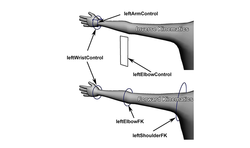 Zwei Controls "leftShoulderFK" und " leftElbowFK" kreieren und an Joints constrainen: