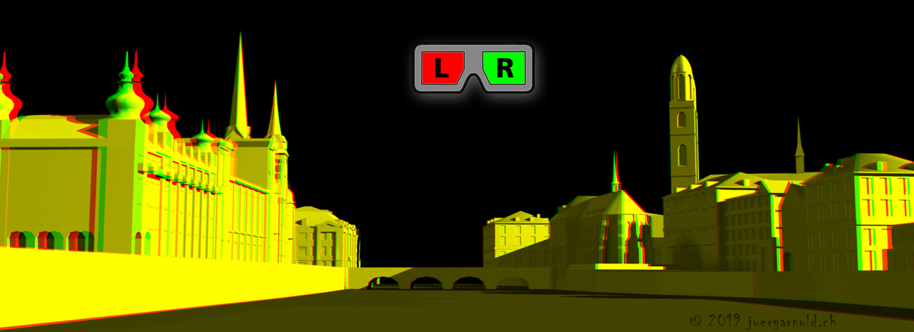 Anaglyphen-Verfahren: Bildtrennung durch die Verwendung von Farbfiltern. (Dafür braucht es eine Bildbetrachtungs-SW und eine 3D-Brille: Links → Rotfilter / Rechts → Grünfilter)