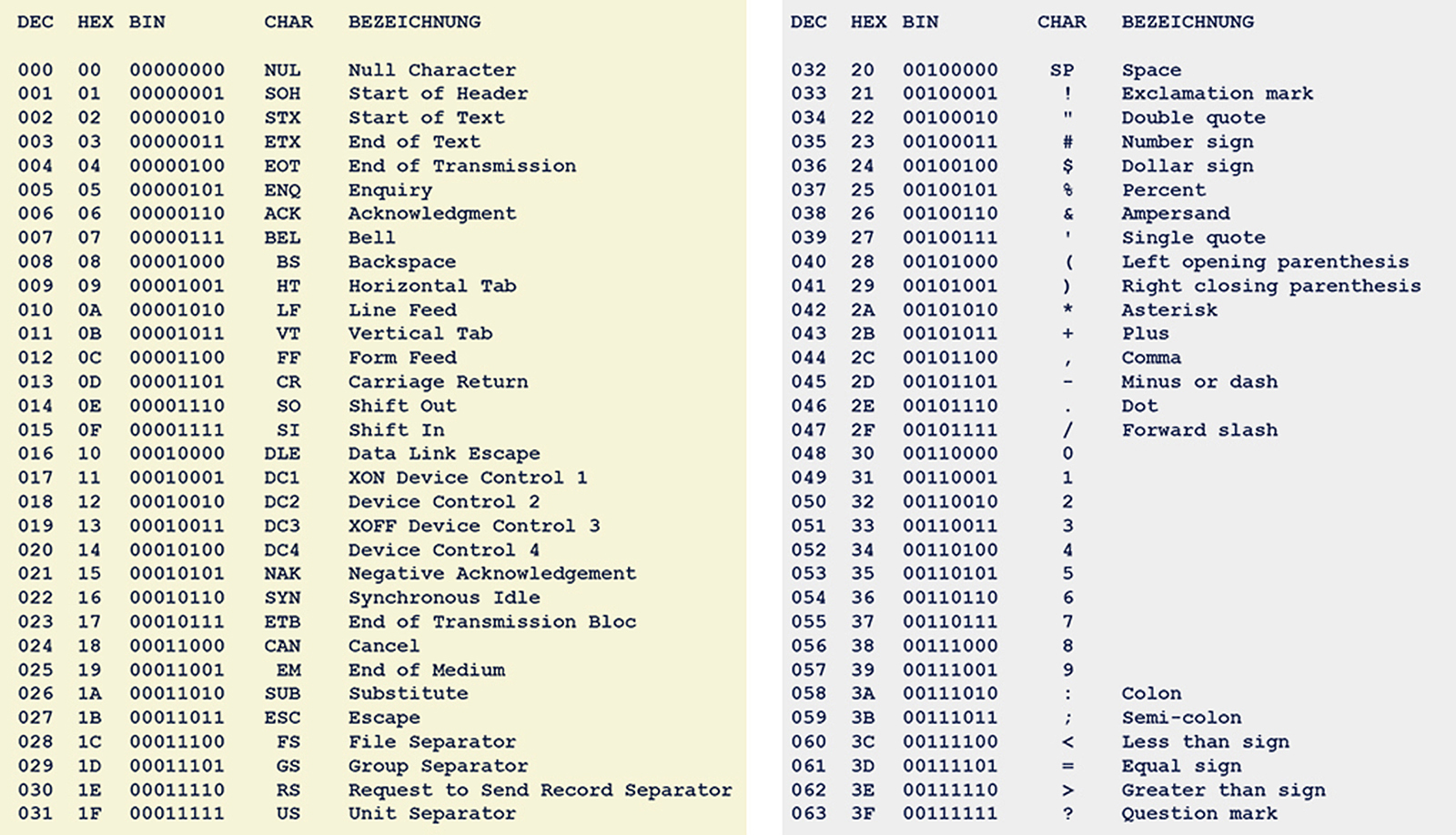 Die 7-Bit ASCII-Tabelle mit den Binär-, Dezimal- und Hexadezimalwerten der 128 Characters (Gelb: Steuerzeichen)