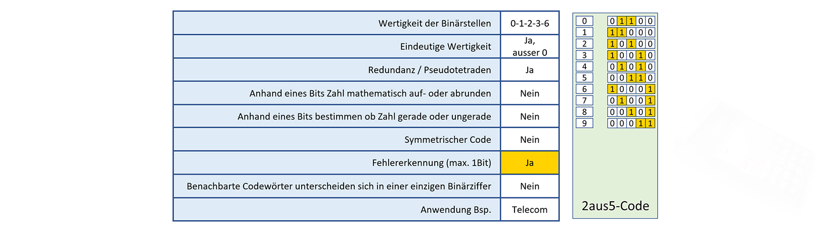 2-aus-5-Code bedeutet: Jeweils 2 Bit sind binär «1», die restlichen drei Bit sind binär «0».