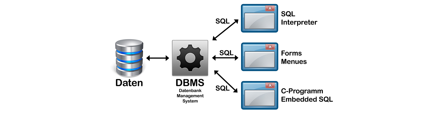 - Das Datenbank-Management-System (DBMS): Der Benutzer bzw. seine Applikation greift niemals direkt auf die Daten zu, sondern immer über ein Kontroll- und Verwaltungssystem.