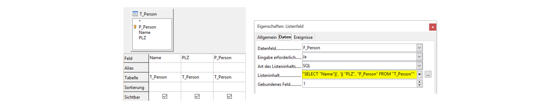 SELECT "Name", "PLZ", "P_Person" FROM "T_Person" - Da im Datenblatt nur eine Kolonne zur Verfügung steht, müssen die beiden Attribute «Name» und «PLZ» im SQL-Kommando wie folgt verknüpft werden: