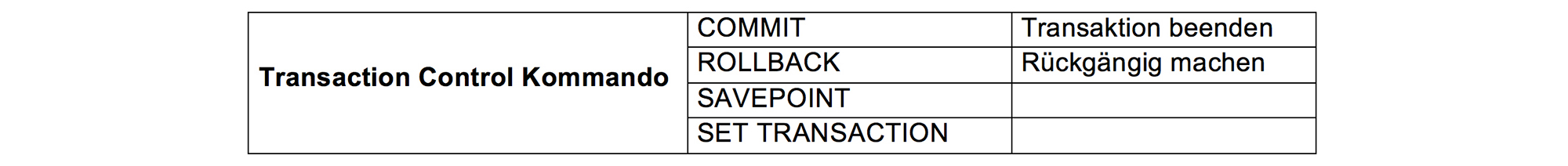 - Datenkontrollsprache DCL: Regeln von Zugriffsrechten, Setzen von Systemparametern, Optimierung der physischen Organisation etc.