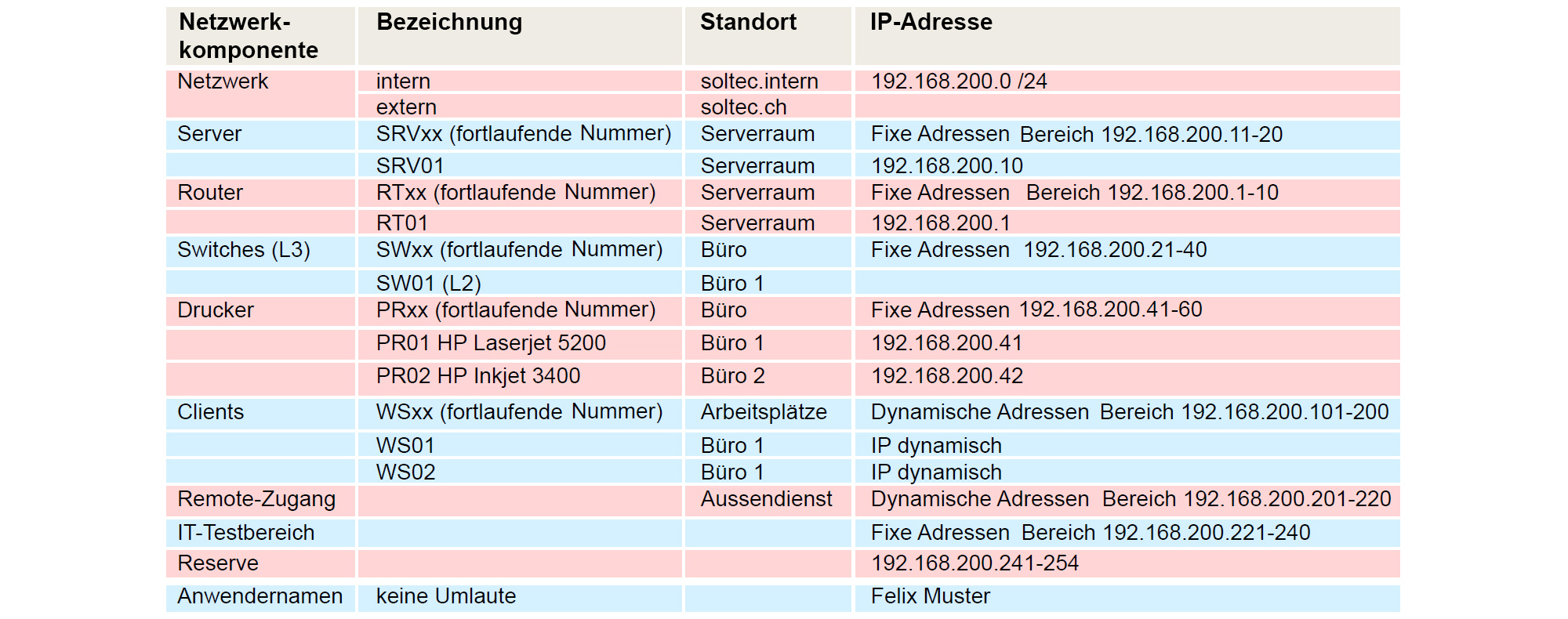 Dazu erstellen sie ein «Logisches Layout», wobei die Bezeichnungen, IP-Adressen, etc. mit denen im Namens- und Adresskonzept übereinstimmen sollten.