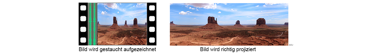 wird bzw. wurde das Bild anamorph aufgezeichnet. Damit konnte man ein breites Bild auf ein schmaleres Format komprimieren (verzerren)