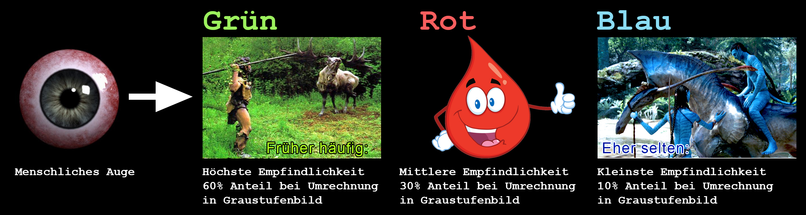 Der frühzeitliche Mensch als Jäger und Sammler war vor allem auf eine hohe Auflösung im Grünbereich (Wälder, Wiesen etc.) angewiesen,