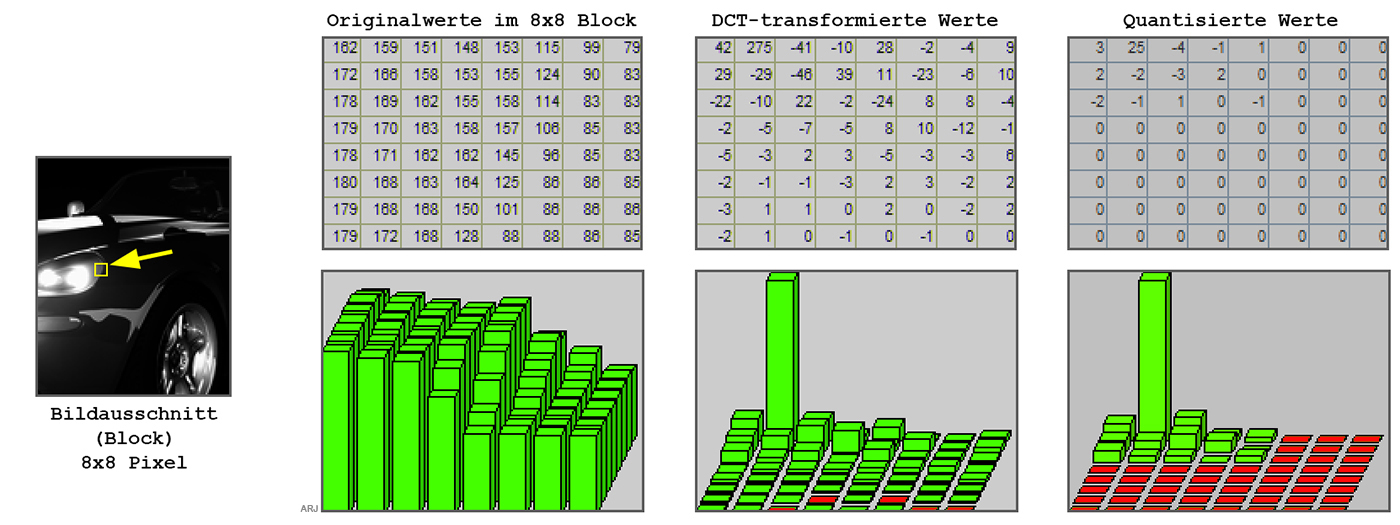 - 3. Schritt: Diskrete Kosinus Transformation (Siehe Bild: DCT-transformierte Werte). Die 8x8 Wertematrix wird nun vom Bildbereich in den sogenannten Frequenzbereich transformiert. Im Bildbereich prägen Unterschiede in den Helligkeitswerten die Wertematrix, wohingegen im Frequenzbereich die Schnelligkeit der Helligkeitsänderungen entscheidend sind. (Etwas vereinfacht ausgedrückt: Scharfe Bilder ergeben schnelle Helligkeitsänderungen und damit viele hohe und unterschiedliche DCT-Werte, unscharfe langsamere und somit tiefere und weniger unterschiedliche DCT-Werte.)