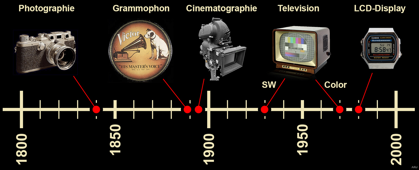 - Von der Camera Obscura zur Digitalen Spiegelreflexkamera DSLR: Das lichtempfindliche Fotomaterial wird von lichtempfindlichen elektronischen Bildaufnahmeelementen (CCD, CMOS-Sensor) abgelöst. Wichtige Kriterien sind die Bildauflösung und die Komprimierung.