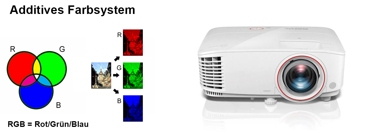 - Additive Farbmischung: RGB = Rot/Grün/Blau. Fernseher, PC-Bildschirm, Beamer etc. Die Komplementärfarben von RGB sind CMY.