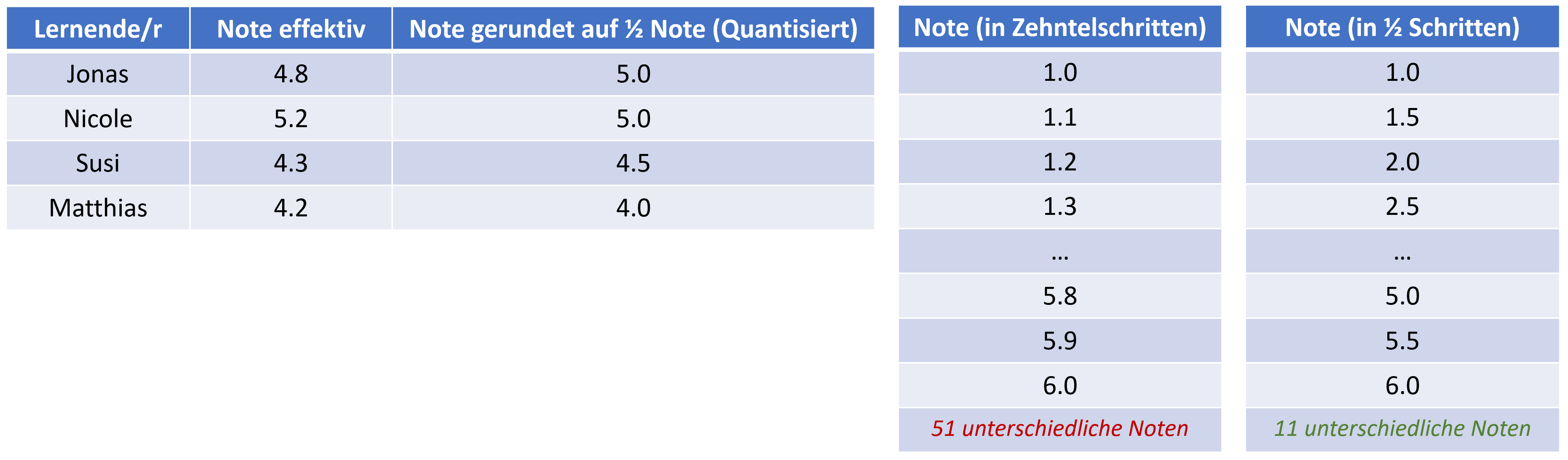 Mit nur 11 unterschiedlichen Noten erreicht man eine Speicherersparnis von 33% gegenüber der Variante mit 51 unterschiedlichen Noten. Allerdings ergibt sich auch ein Informationsverlust. Aus den gerundeten Noten ist nicht mehr ersichtlich, dass Nicole fast eine halbe Note höher liegt als Jonas. Ähnlich bei Susi, die zwar nur 1/10 höher liegt, gerundet aber eine um eine halbe Note höhere Bewertung erhält.