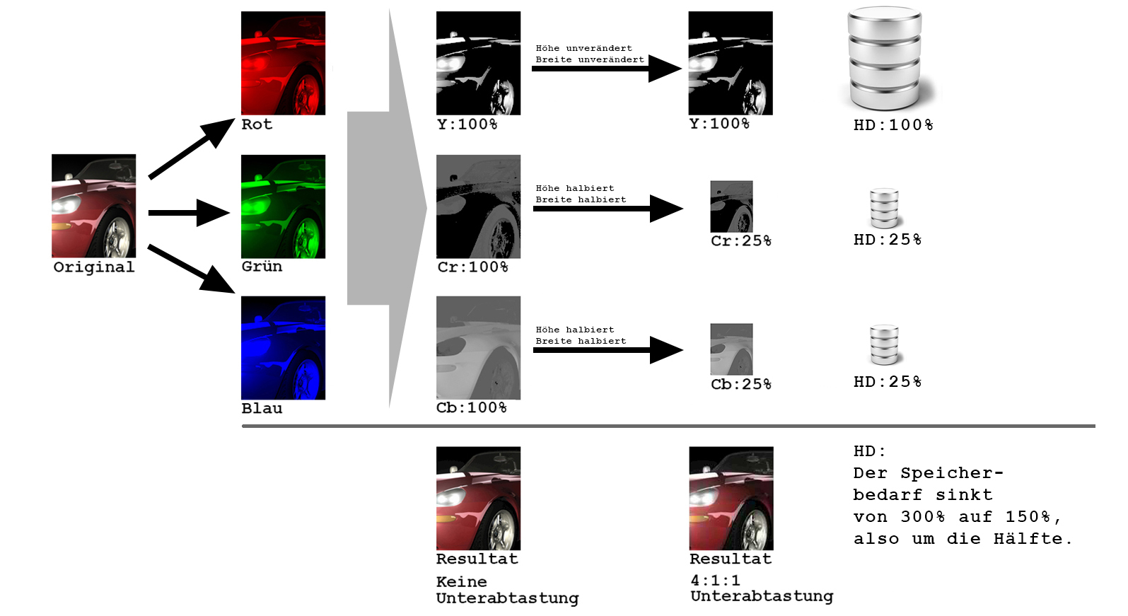 Ohne Unterabtastung trägt jeder Kanal mit je 100% zum Gesamtvolumen (300%) bei. Mit einer Unterabtastung von 4:1:1 bedeutet dies ein Y-Anteil=100%, Cr-Anteil=25%, Cb-Anteil=25% und somit ein Gesamtvolumen von 150%. Der Speicherbedatf hat sich nun halbiert bzw. von 300% auf 150% gesenkt.